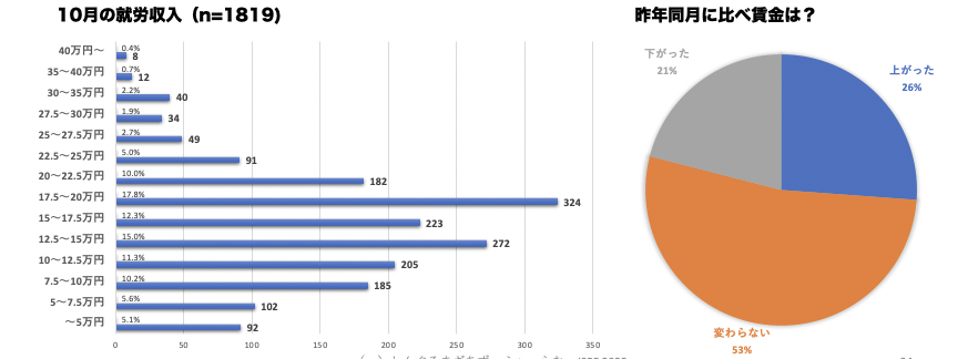 10月の就労収入は20万円未満が77%を占めました。