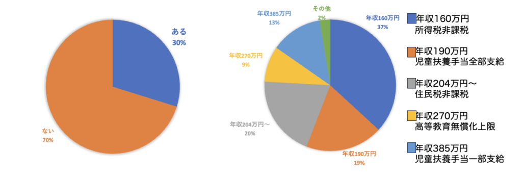 年収の壁を意識して就労を抑制したことがある人が30%いました。内訳は所得税非課税(年収160万円)が37%、児童扶養手当全部支給(年収190万円)が19%、住民税非課税(年収204万円〜)が20%、高等教育無償化上限額(年収270万円)が9%、児童扶養手当一部支給(年収385万円)が13%でした。