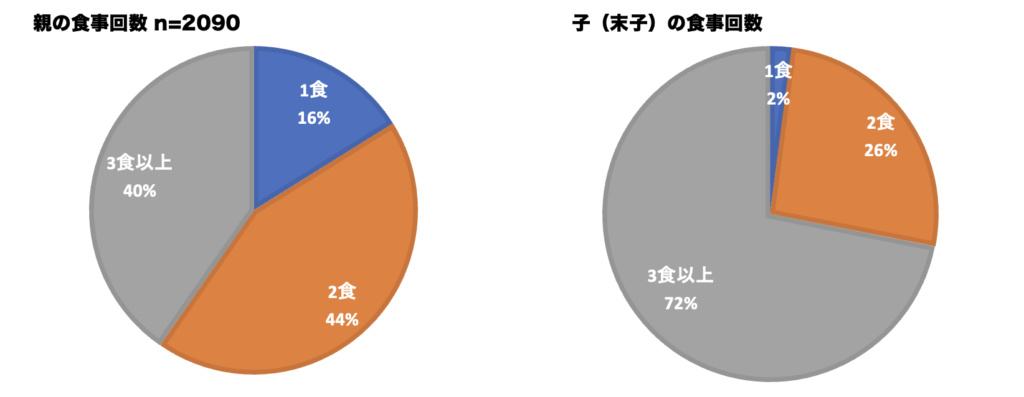 親の食事回数は「1食」16%、「2食」44%、子の食事回数は「1食」2%、「2食」26%。