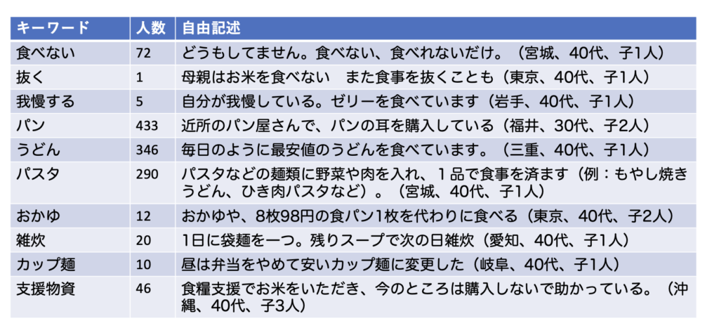 お米が買えない時の食事について自由記述から、キーワードを抽出しました。