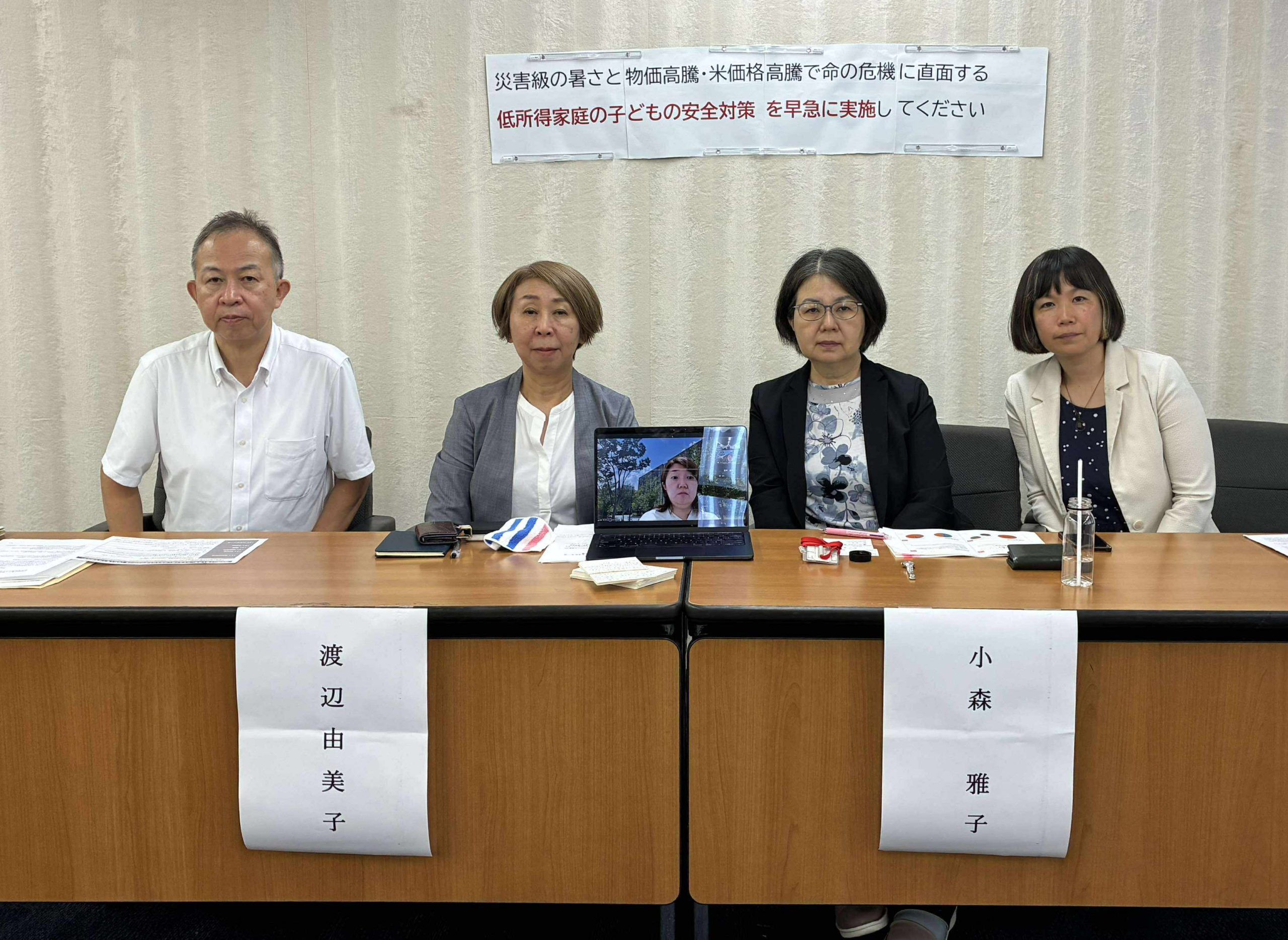 しんぐるまざあず・ふぉーらむなど、困窮世帯の子どもたちの支援に取り組む4団体が8月6日、厚生労働省で記者会見を開き、災害級の酷暑と物価高騰が続く2025年の夏休みに子どもたちの命を守るための特別給付金を支給するよう、政府に求めました。