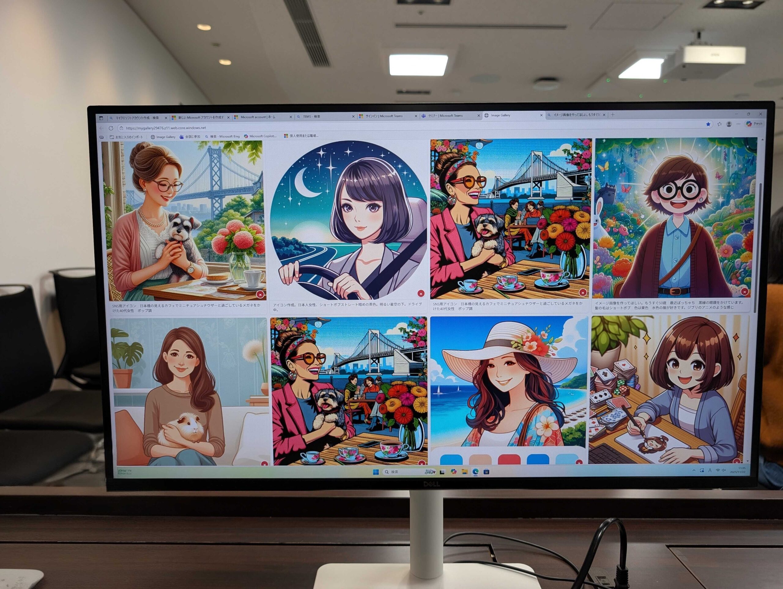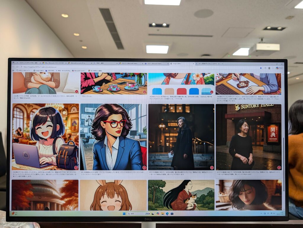 まず、それぞれが自己紹介用のアイコンを作る「画像生成」。マイクロソフトの会議用アプリTeamsに参加し、Image Creatorにプロンプトを書き込みます。女性、茶髪、眼鏡あり、日本アニメ風など、具体的なイメージがつかめる指示を出すのがコツです。