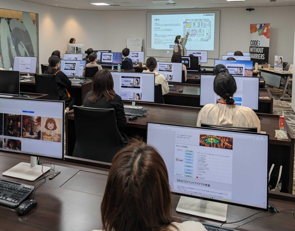 セミナーはマイクロソフト社が展開するAI学習プログラム「CODE;WITHOUT BARRIERS(コード・ウィズアウト・バリアーズ)」の講座から一部を抜き出す形で行われました。講師は大渓明日香さん、細野純子さん、河村明子さんです。