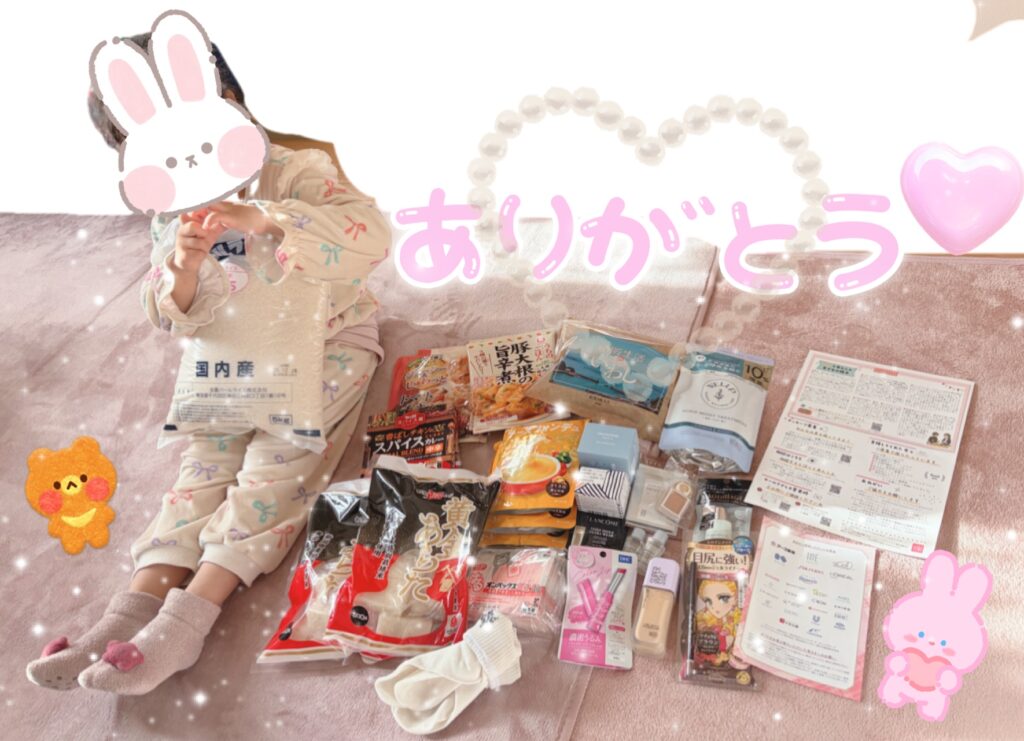 〇この度もたくさんの食品や生活品をありがとうございました!お正月にお餅が食べられることがとても嬉しいです。コスメも普段は100円商品を使っているのでなんだか勿体なくて使えません。お菓子も入っており、子どももとっても喜んでいます!