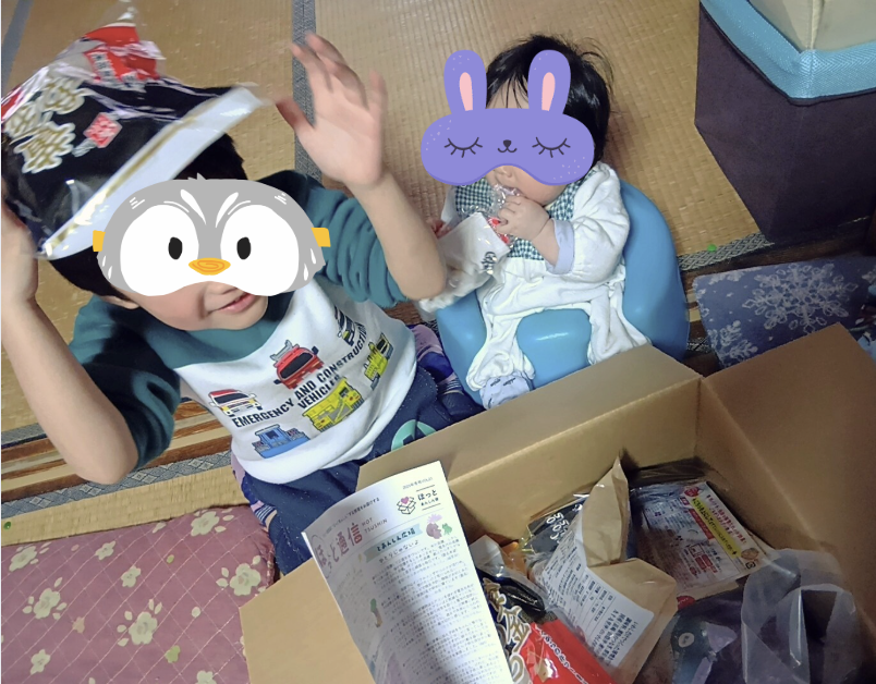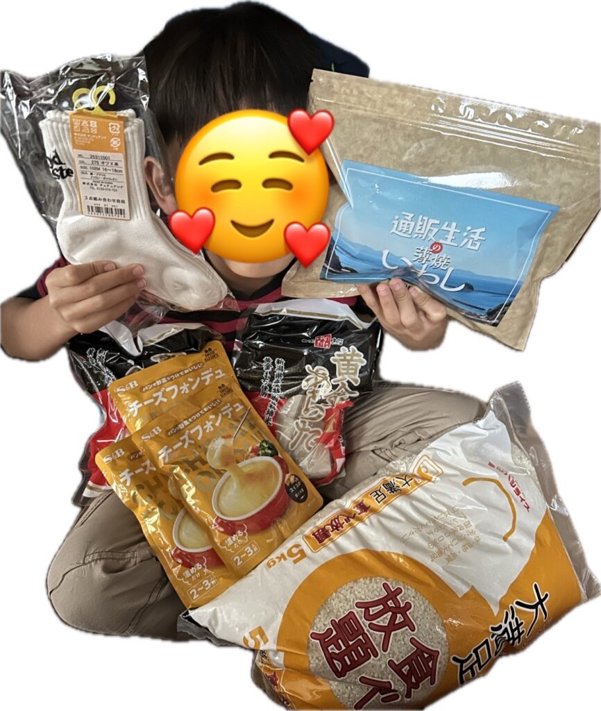 〇届いた瞬間すぐさま母より先に真っ先に段ボールを開け、「重たい重たい〜」って言いながらとても嬉しそうな笑顔で、中身を取り出すごとに母に紹介してくれる子どもの姿に凄く感激し、それにつられて母も少しだけど笑顔を取り戻す事ができ、うるうると涙ぐみました。子どもの喜んでいる姿がとてもとても美しく思えました。生活がとても困難な私達親子の為に頂いた事深く感謝の気持ちでいっぱいです。何もかも高騰の中これからもまだまだ困難乗り越える毎日が続きますが、親子でいつも笑顔が出るようますます家事育児等頑張って乗り越えていこうと思います。