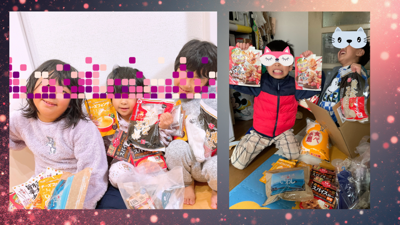 〇食べ盛りの子ども4人をひとりで育てています。特に給食がなくなる長期休みは買っても買ってもあっという間に食料がなくなってしまいます。スポーツの部活をやっている子や受験生がいるのでちゃんとしたご飯を食べさせてあげたいです。また、普段から質より量を重視し、とにかく3食食べることに必死なため、チーズフォンデュや本格的なレトルトカレーなど買う余裕もなかったのでとても喜んでおりました。今回色々な種類のメイクグッズが入っていてものすごく嬉しかったです。普段から疲れた顔して老けてみえるとよく言われるので、ちょっとでも年相応に見えるよう、3月にある小中高の卒業式ではちゃんとメイクをしてみようと思います!