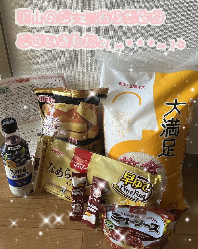 ★お米もおいしく、涙が出ました。ホットケーキミックスの粉もあり、子どもたちが「食べたかったんだ!」と言っていた声を聞き、私は、いつも値引きしか見れなくなっていて、子どもの食べたいものを聞くこともなかったのだと、余裕のない自分自身を見つめ直す事も必要だと思いました。