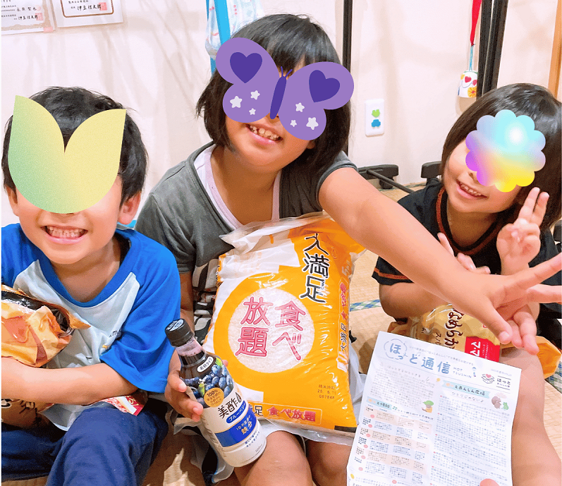 ★食料の支援の品物が届いた時、子どもたちが重い段ボール箱を見て、すごく喜んでいました。普段、お菓子を買わないのでお菓子が入っているのを見たときにも喜んでいました。そして、お友だちにも分けていたのを見て、普段食べられないお菓子を人に配るなんて偉いなと思いました。フルタイムの仕事をしているので、ニュースで話題の備蓄米などは並んで購入できないので、本当に助かりました。このようなご支援が生活の手助けとなります。困っている方に届けてくださる企業や団体に感謝しています。子どもたちのお腹を満たせることにすごく嬉しいです。